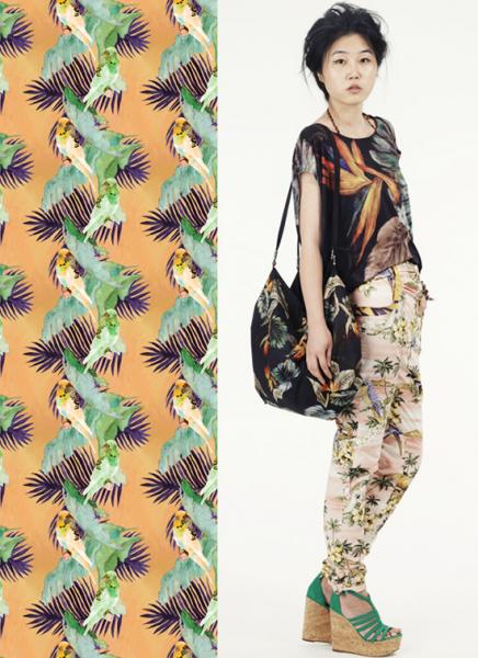 Thật khó để nói khuôn khổ nào cho họa tiết nhiệt đới, bởi cách phối vô cùng phóng khoáng, ngẫu hứng.