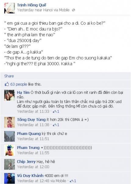 Xahoi – Mới đây, Hồng Quế đã liên tiếp lên tiếng chế giễu phát ngôn “từng được đại gia gạ gẫm 20.000 USD” của “bà mẹ nhí” Phương Trinh trên trang Facebook của mình.