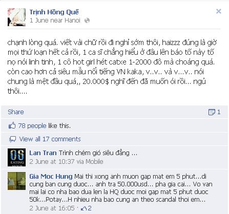 Câu status ám chỉ phát ngôn gây sốc của Phương Trinh mà Hồng Quế đã đăng trên trang Facebook của cô.