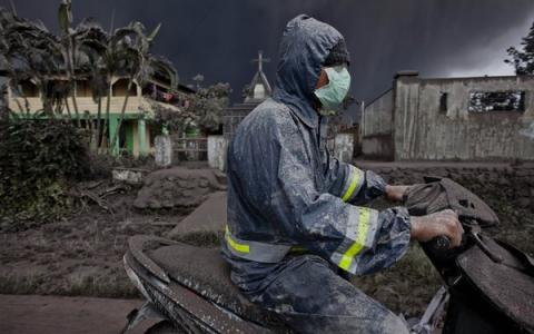 Tất cả như chìm trong bóng tối khi núi lửa Sinabung hoạt động.