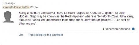 Một độc giả có tên Kenneth Deardorff viết: “Là một cựu chiến binh Mỹ từng chiến đấu ở chiến trường Việt Nam, tôi tôn trọng tướng Giáp hơn ông John McCain rất nhiều. Tướng Giáp được gọi là “Napoleon đỏ” trong khi thượng nghị sĩ McCain, John Kerry… đang tiêu diệt nước Mỹ của chúng tôi thông qua các chiêu bài chính trị hoặc "các cuộc chiến tranh bằng mọi phương tiện”.