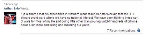 Trong một bình luận khác, độc giả ký tên là Arthur Sido viết: “Đó là một sự xấu hổ mà kinh nghiệm của mình tại Việt Nam không dạy Thượng nghị sĩ McCain rằng Hoa Kỳ nên tránh xa những cuộc chiến tranh vô nghĩa. Chúng tôi đã phải tham gia những cuộc chiến kiểu vậy gần hết cuộc đời mình và cùng với đó là tiêu tốn hàng trăm tỷ USD, khiến những thanh niên Mỹ bị tàn tật suốt đời”.