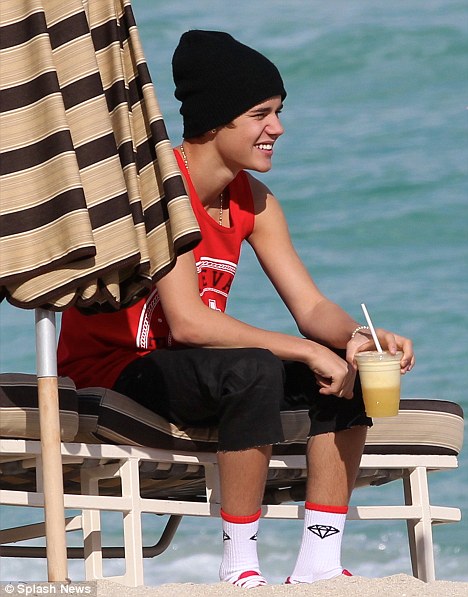 Chàng ca sỹ 17 tuổi thưởng thức đồ uống lạnh dưới cái nóng trong khi Ryan chuẩn bị tắm nắng