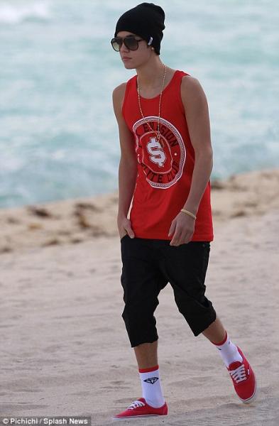 Mặc dù thời tiết ở Florida khá nóng, thế nhưng danh ca của Baby lại mặc một chiếc quần jeans lửng màu đen, áo ba lỗ đỏ, giày tất chỉn chu cùng một chiếc mũ len.
