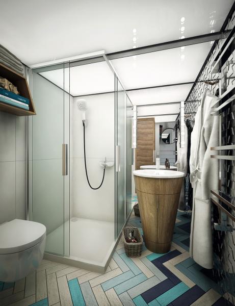 Nhà tắm được thiết kế với diện tích tương đương với diện tích phòng ngủ ở phía trên cũng không kém phần cá tính. Vẫn là những lớp đá lát đầy ấn tượng kết hợp với chất liệu gỗ tự nhiên cho khu vực bồn rửa. Thay vì sử dụng móc treo, căn hộ thiết kế riêng một mảng tường bằng thép mắt cáo, tạo ra một khu vực lưu trữ thoải mái với mọi mục đích sử dụng.