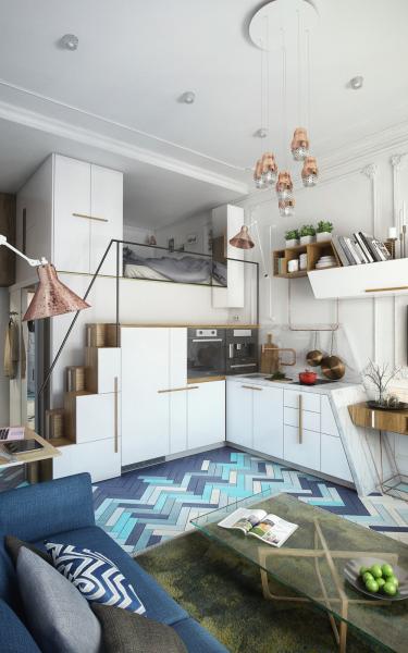 Với một không gian sống không lớn, việc lựa chọn tông màu trắng chủ đạo có lẽ chính là lựa chọn thông minh nhất. Bên cạnh đó, căn hộ cũng biết cách khéo léo kết hợp với gam xanh lam tươi sáng để tạo được hiệu ứng ảo giác về không gian, giúp nó trông rộng hơn diện tích thực. Để có đầy đủ không gian cho tất cả khu vực cần thiết trong không phải là một điều dễ dàng, đặc biệt khi căn hộ sở hữu một diện tích nhỏ hẹp như thế này. Một giải pháp thông minh được căn hộ sử dụng chính là tạo ra một không gian phòng ngủ riêng biệt phía trên nhà tắm.