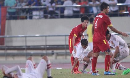 Đội trưởng Trọng Đại và Văn Hóa chạy lại kéo đội trưởng U19 Lào - Anouwath đứng dậy khi anh này nằm gục xuống sân.