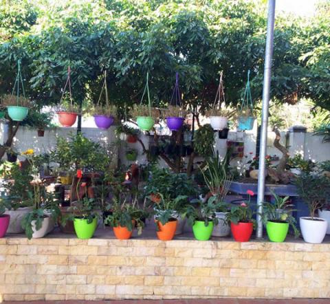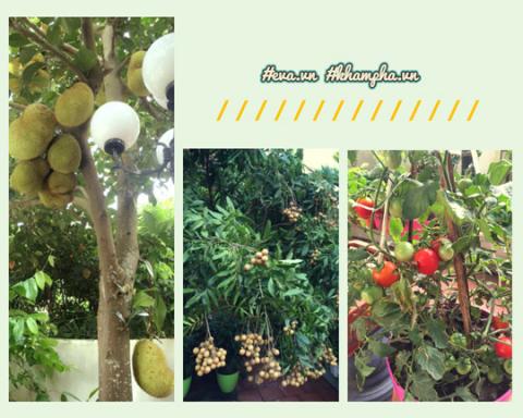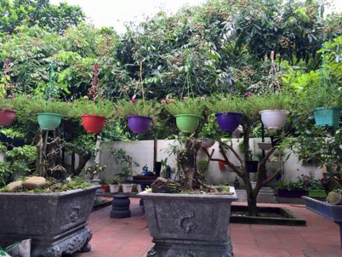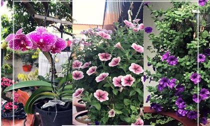Để không gian vườn thêm phần rực rỡ hơn, chị Điệp chọn những chậu hoa nhiều màu sắc để trồng. Thậm chí, chị còn thiết kế kệ giáp tường để đặt các chậu hoa theo tầng. Những cây tán rộng, cây ăn quả lâu năm chị tận dụng cành để lấy chỗ treo giỏ hoa lan, vừa đẹp lại vừa tiện lợi, không mất công thiết kế khung treo.