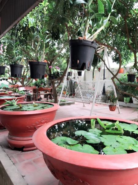 Như kiến tha mồi về tổ, dần dần đến nay sau 3 năm xây dựng, khu vườn của chị từ những góc cỏ mọc um tùm, giờ đây đã được phủ kín bằng những chậu cây, giỏ hoa đẹp rực rỡ. Vườn hiện có khoảng 200 chậu và giỏ hoa với đa dạng các loại hoa như hoa lan, hồng, nguyệt quế, hoa nhài nhật, sử quân tử, mẫu đơn, râm bụt, hoa sen, hoa súng,….