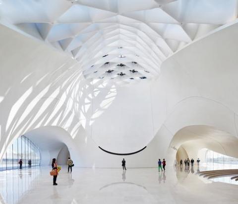 Như được hòa mình vào cảnh quan, các hình thức của tòa nhà gợi lên một sự tương tác với yếu tố tự nhiên của địa hình. Tòa nhà hiện lên như thể nó đã được chạm khắc bởi các yêu tố gió và nước, cấu trúc cong và chất lỏng (bọc trong tấm nhôm trắng mịn) thấm nhuần một vẻ đẹp mạnh mẽ nhưng đầy chất thơ. Khối kiến trúc nhấp nhô bao gồm những sân khấu lớn và nhỏ cùng một trung tâm thương mại công cộng lớn.