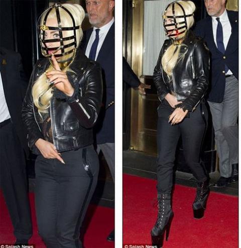 Bước ra khỏi khách sạn New York hôm cuối tuần qua, nữ ca sĩ Lady Gaga khiến bao con mắt xung quanh phải ngoái nhìn không phải bởi gu ăn mặc hở hang như thường thấy mà lần này cô lại mặc bộ đồ khá kín đáo và đặc biệt nguỵ trang mặt với đầu bằng chiếc mũ như lồng hay nói cách khác như rọ mõm.