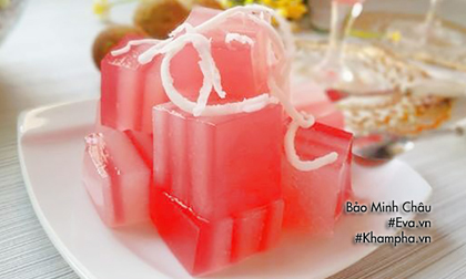 Bước 5: Để thạch thật nguội rồi cho vào ngăn mát khoảng 2 giờ đồng hồ, sau đó lấy ra cắt miếng vuông vừa ăn, xếp vào đĩa, rắc dừa non nạo lên trên và mời mọi người thưởng thức.