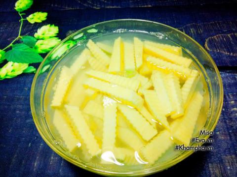 Bước 2: Sau đó cho xoài vào tô ngâm với nước muối pha loãng (dùng nước đun sôi để nguội để làm). Thời gian ngâm khoảng 10-15 phút, vớt ra rửa lại với nước sạch, để ráo.