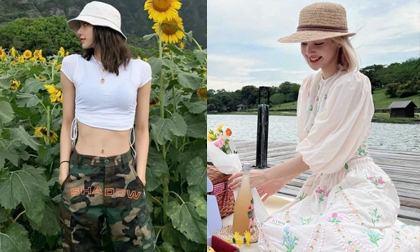 có phom dáng dài, cổ tròn và phần tay lỡ bồng bềnh được nữ idol mix thêm chiếc mũ cói