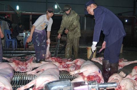 Việc giết mổ cũng đã có sự tiến bộ hơn, trên sàn inox và có Thú y giám sát