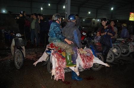 Trung bình một ngày, hơn 1.000 con lợn được giết mổ tại đây, nhưng tất cả được chuyên chở bằng xe máy ra chợ, không có sự che đậy.