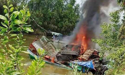 Sau tiếng nổ lớn, chiếc phà đã bốc cháy ngùn ngụt khiến 2 người văng xuống kênh, trong đó có người tử vong, 2 người còn lại nằm bất động trên phà.