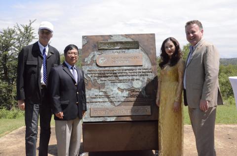 Nàng kiều nữ và các vị quan khách chụp hình kỷ niệm bên biểu tượng của tổ chức New 7 Wonders trao cho Núi Bàn.