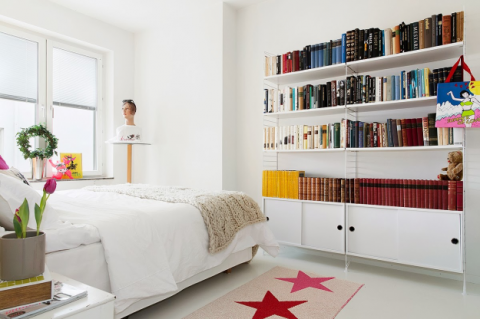 gối nằm, đèn ngủ, chậu cây xanh và vô vàn những cuốn sách trên kệ.
