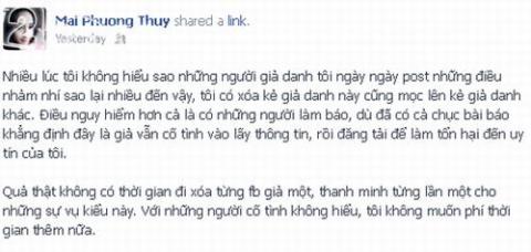 Trước sự việc quá nghiêm trọng và ảnh hưởng đến danh tiếng của mình. Mai Phương Thúy vô cùng bức xúc vì cách làm việc thiếu hiểu biết của một vài nguồn tin đã ảnh hưởng đến thanh danh của người đẹp. Mai Phương Thúy khẳng định, Facebook đưa status vừa rồi là giả mạo, và hiện tại cô chỉ dùng facebook cá nhân, có một lượng bạn bè nhất định và những gì cô chia sẻ đều để ở chế độ bạn bè mới có thể xem được.