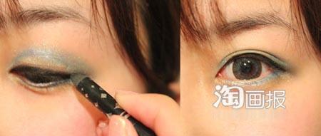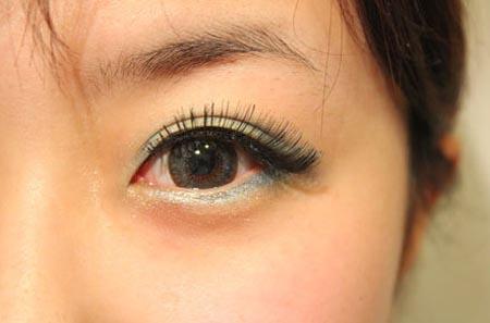 Sau khi dán mí giả (áp dụng với những bạn có mí mắt nhỏ), phủ một lớp phấn màu vàng nhũ lên toàn bộ bầu mắt trên. Tiếp đến, phủ phấn màu xanh biển vào đuôi mắt theo hình chữ V.
