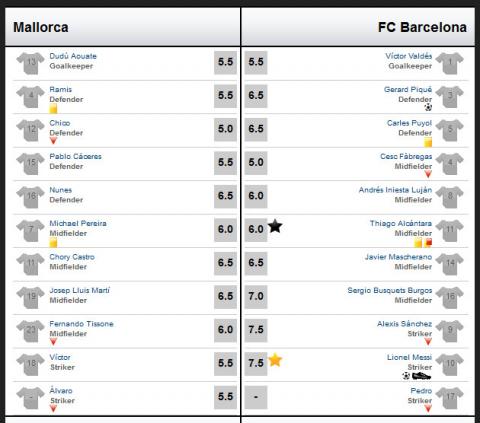 Mải mê tham gia tấn công, suýt chút nữa Los Blaugrana đã phải trả giá khi Mallorca có một pha phản công mẫu mực và người kết thúc là Alvaro nhưng bóng lại đi chệch cột dọc trong gang tấc. Tuy nhiên, đó cũng là tất cả những gì đội chủ nhà làm được. Không lâu sau pha bỏ lỡ của Alvaro, từ một quả phạt cố định, Messi thực hiện một cú sút kỹ thuật đưa bóng đi vào góc gần khung thành đem về bàn mở tỉ số cho Barca.