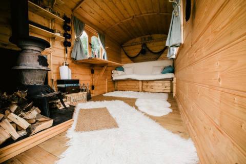 Ngôi nhà làm từ gỗ cùng với những thảm lông đem lại cảm giác ấm cúng.