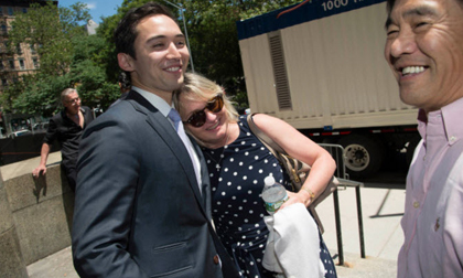 Nick Liu (trái) và mẹ của mình vui mừng sau phán quyết của tòa án