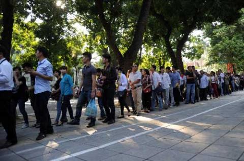 Từ sáng sớm, trên đường Hoàng Diệu, từng dòng người xếp hàng vào viếng cố Đại tướng Võ Nguyên Giáp. Ảnh: Nguyên Anh.