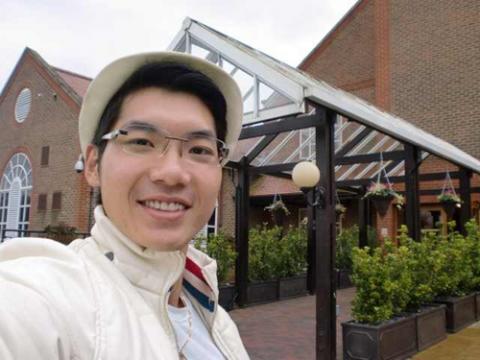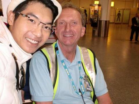 Anh chụp ảnh với đại diện của Macau - thí sinh anh gặp đầu tiên tại sân bay.