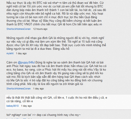 "Đúng là nghe lại so sánh âm thanh bài Quỳnh Anh hát và bài anh Phúc hát ngay sau đó hai cái âm thanh khác hẳn nhau. Lúc Quỳnh Anh hát không có eco, không bass, không vang, còn anh Phúc hát thì mấy hiệu ứng này rất nhiều.Vậy là không công bằng cho Quỳnh Anh và với âm thanh vậy thì giọng nào cũng sẽ bị phô khi không sát mic. Rõ là kịch bản sắp sẵn để dìm hàng loại Quỳnh Anh theo cách sốc nhất rùi. Mẹ Quỳnh Anh bị sốc vì trò sắp đặt không công bằng nên không đồng tình với chương trình cũng phải."