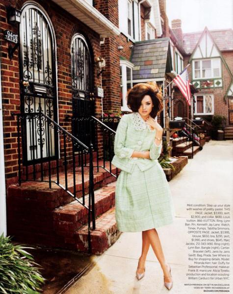 Trên tạp chí Harper's Bazzar US số tháng tư, Miranda Kerr được tạo hình theo phong cách những năm 50 với mái tóc ngắn xoăn bồng bềnh và đôi mắt kẻ viền đen sắc nét.