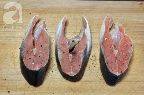 Cá hồi rửa sạch, để ráo, rắc tí muối tiêu cả hai mặt cho thấm gia vị.