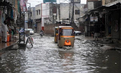 Mưa lớn kéo dài khiến các con đường ở Pakistan ngập nước. Ảnh: INP