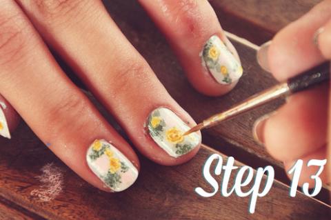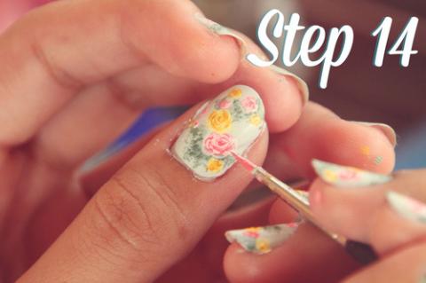 Bước 13: Dùng màu vàng và màu hồng đậm hơn để vẽ cánh hoa, hoàn thiện mẫu nail.