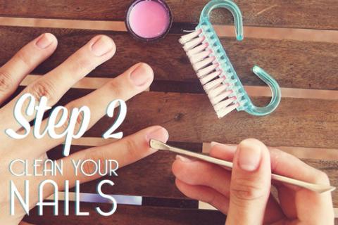 Bước 1 và 2: Làm sạch lớp sơn cũ (nếu có) và cắt bỏ những phần da thừa, cho bề mặt móng sạch đẹp.
