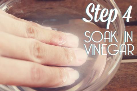 Bước 3 và 4: Rửa sạch tay bằng xà phòng, sau đó, ngâm phần móng tay trong nước dấm pha loãng. Cách này giúp sơn móng lâu bị bong ra vì dấm có khả năng là sạch lớp dầu tự nhiên trên móng tay.