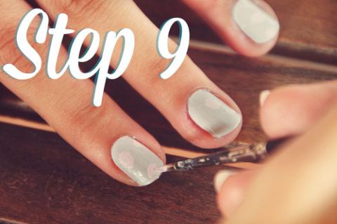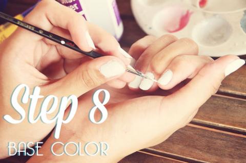 Bước 8: Sơn toàn bộ bề mặt móng bằng màu trắng ngọc trai. Bạn nên sơn hai lớp để màu sắc đều hơn.