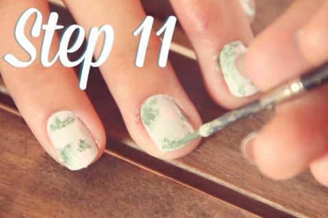 Bước 11: Vẽ họa tiết lá cây bằng màu xanh đậm xung quanh họa tiết bông hoa vừa vẽ, phía trên đầu móng và góc dưới.