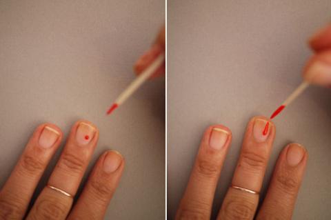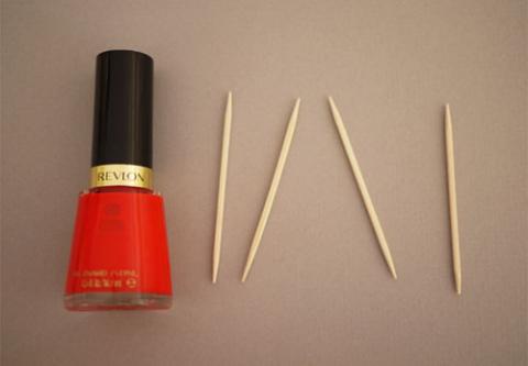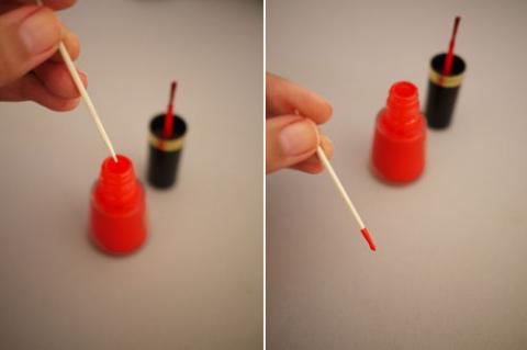 Bước 1: Nhúng tăm vào lọ sơn móng sao cho có một vài giọt sơn ở cuối đầu tăm.