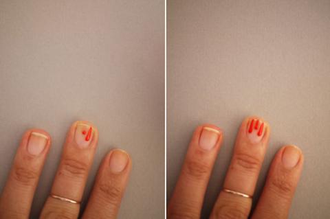 Bước 4: Cuối cùng, nhúng tăm vào lọ sơn và kéo một đường trên đầu móng. Đánh một lớp sơn nền giúp móng thêm sáng bóng. Lần lượt làm tương tự ở các móng còn lại.