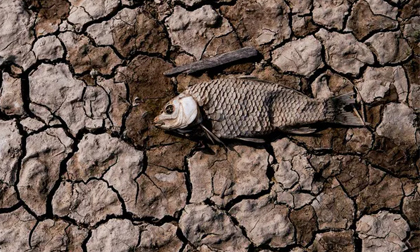 Một con cá chết khô giữa lớp bùn nứt trên lòng hồ Poyang, hồ nước ngọt lớn nhất Trung Quốc,