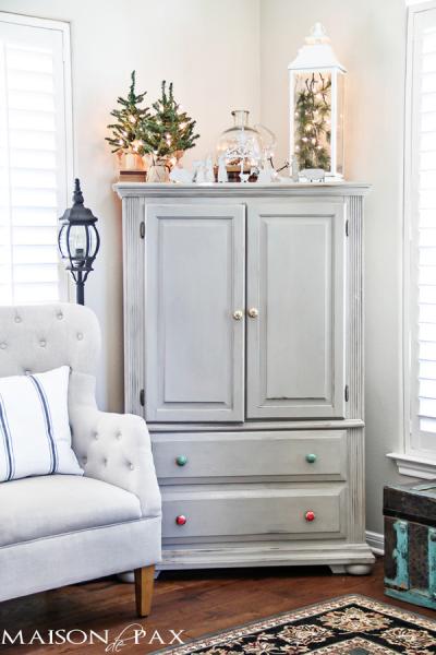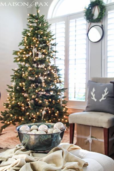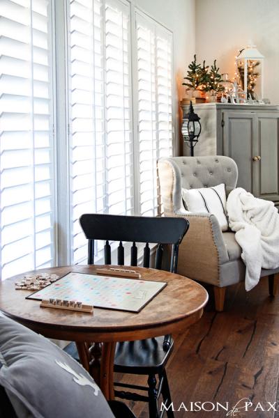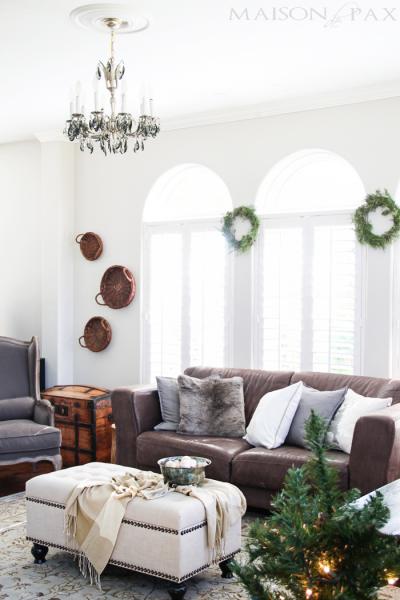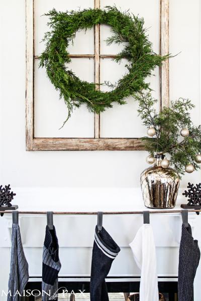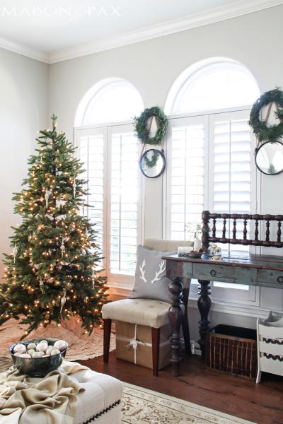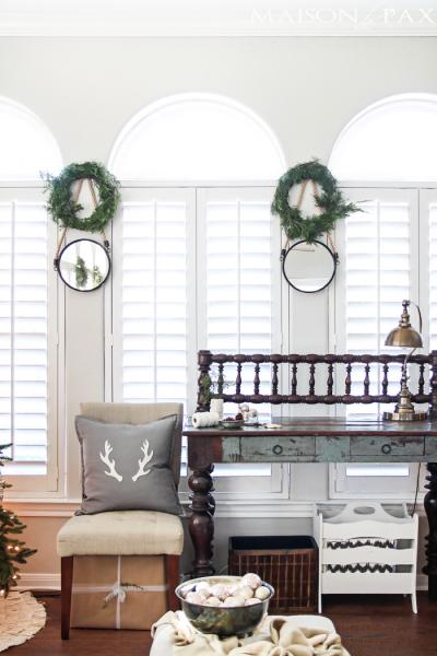 Mặt sau của bức tường này được trang trí bởi vòng nguyệt quế trên khung gỗ mộc mạc. Lọ hoa màu vàng đồng với những nhánh tuyết tùng và quả châu, phía dưới treo những đôi vớ dài. Vì người ta truyền tai nhau rằng, món quà Giáng sinh của ông già Noel sẽ được đặt vào trong những chiếc vớ nếu bạn treo chúng ở lò sưởi hoặc giường ngủ. Nội thất của phòng sinh hoạt khá giản dị với chiếc bàn gỗ tròn và tủ gỗ sơn xám. Dĩ nhiên là chủ nhân không quên cập nhật những món đồ mùa lễ hội như cây thông nhỏ trên đầu tủ, đèn bão, mô hình gỗ, gối ôm hình tuần lộc hay lẵng quả thông bằng mây tre nhỏ xinh…