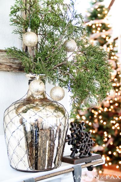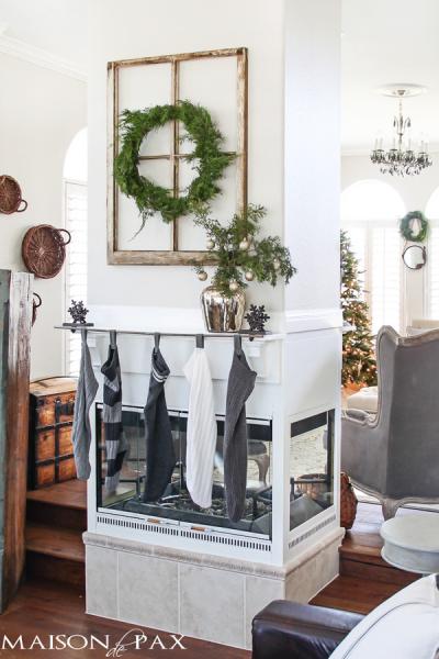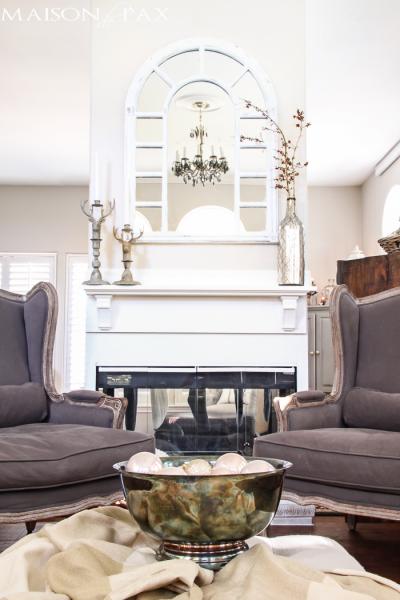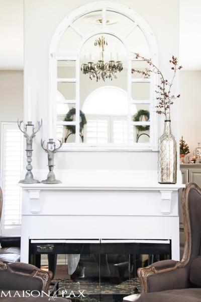 Một điểm thu hút nữa của ngôi nhà chính là khu vực lò sưởi được design sáng tạo, đồng thời cũng là cầu nối giữa phòng khách và phòng sinh hoạt gia đình. Vẫn trung thành với phong cách nhẹ nhàng, thanh lịch, bên trên đặt cặp chân nến hình những chú tuần lộc đúng với chủ đề Giáng sinh, chiếc lọ cao cổ lấp lánh với nhành quả mọng được chọn ngay từ chính sân vườn của Ashley. Bên trên là tấm gương cách điệu đặt trong khung cửa, vừa sáng tạo vừa khiến cho căn phòng như rộng hơn so với diện tích thật.