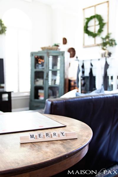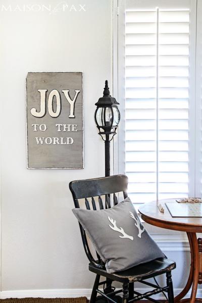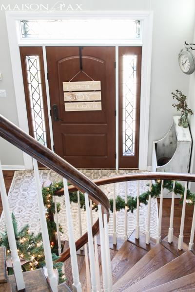 Ashley chia sẻ, cô rất thích tự tay làm những món đồ trang trí nhà ở, đặc biệt là vào những dịp lễ hội. Vì thế, bạn sẽ không mấy ngạc nhiên khi cô tái chế những tờ giấy in bản nhạc để tạo những hai bông hoa xinh xắn trên bức tường nơi dẫn lên tầng hai của ngôi nhà. Đứng từ bậc cầu thang trên cao nhìn xuống, bạn sẽ thấy những tấm bảng gỗ tự chế treo trên cánh cửa ra vào với dòng phấn trắng đề “Wishing you PEACE, JOY, and LOVE” đầy ý nghĩa.