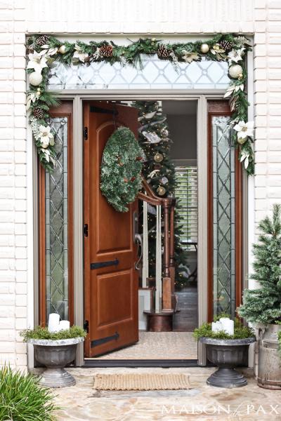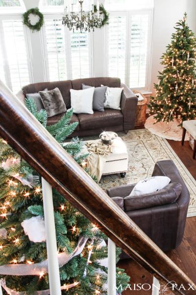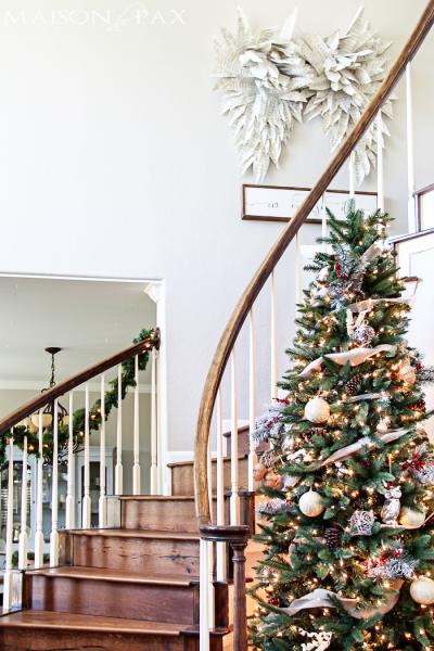 Khu vực mặt tiền được tô điểm bởi dây treo trang trí với sắc trắng và xanh lá cây chủ đạo. Hai chậu cây đối xứng với những chiếc nến lớn đặt ở giữa, vòng nguyệt quế tuy giản đơn trên cánh cửa gỗ nhưng lại quyến rũ như chào đón những vị khách đến thăm nhà. Bước vào bên trong, bạn sẽ nhận thấy khu vực cầu thang trung tâm được “chăm sóc” kỹ lưỡng hơn cả. Sử dụng dây tuyết tùng kết hợp với đèn nháy để “làm điệu” cho phần tay vịn. Phía chân cầu thang được đặt một cây thông Noel với chiều cao tương xứng, dĩ nhiên là Ashley không quên treo lên đó những quả thông, đèn, hạt châu và những phụ kiện nhỏ nhắn xinh xinh khác.