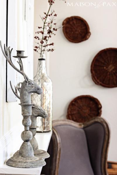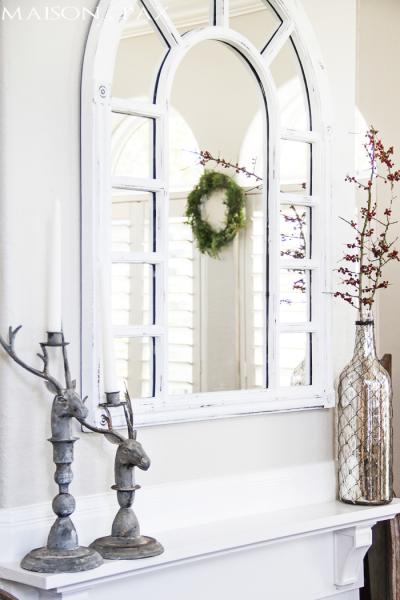 Tấm gương cách điệu trong khung cửa, cặp chân nến hình những chú