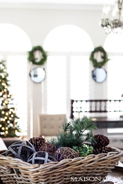 Trên bức tường với gam màu trắng thanh lịch là những món phụ kiện nhẹ nhàng để tạo điểm nhấn. Ấy là vòng nguyệt quế màu xanh lá cây tuyết tùng, là những chiếc giỏ mây nhiều kích thước, là cặp gương soi hình tròn treo nơi ô cửa… Bên cạnh cây thông Noel ở chân cầu thang, chủ nhân của nó còn mạnh tay sắm thêm hai cây thông lớn bé nữa để trưng bày cho phòng khách. Thậm chí trên bàn cafe, bàn gỗ,… cũng được đầu tư những món phụ kiện tinh tế như những quả châu tròn lấp lánh, lọ hoa trang nhã hay đèn để bàn màu vàng đồng cổ điển.