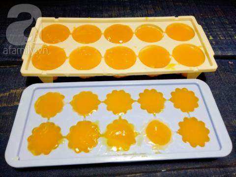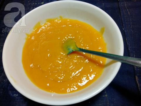 Xoài chín gọt vỏ rồi thái nhỏ, cho vào máy sinh tố xay nhuyễn cùng với 1 ít nước lọc. Sau đó, lọc xoài qua ray để lấy phần thịt xoài nhuyễn mịn.