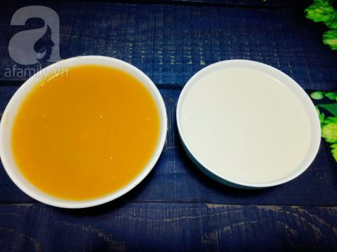 Phần thạch xoài: Trộn nước agar với xoài xay nhuyễn, trộn thật đều để thành hỗn hợp thạch xoài. Phần thạch sữa: trộn nước agar với sữa tươi, trộn thật đều để thành hỗn hợp thạch sữa.